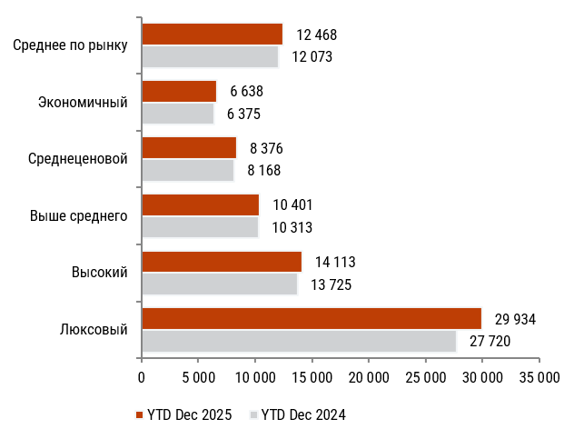 Прирост Средней цены на номер для рынка качественных отелей за 2025 г. по сравнению с 2024 г. составил 3,3% (с 12 073 руб. до 12 468 руб.), при этом произошло это, во многом, за счет 8-процентного увеличения данного показателя в отелях Люксового сегмента. Остальные ценовые сегменты росли существенно медленнее (в среднем, на 2,6%), что гораздо ниже прогнозируемого экспертами ЦБ в декабре 2025 г. среднегодового темпа инфляции на 2025 г. (8,8%) и указывает на охлаждение спроса из-за состояния экономики.